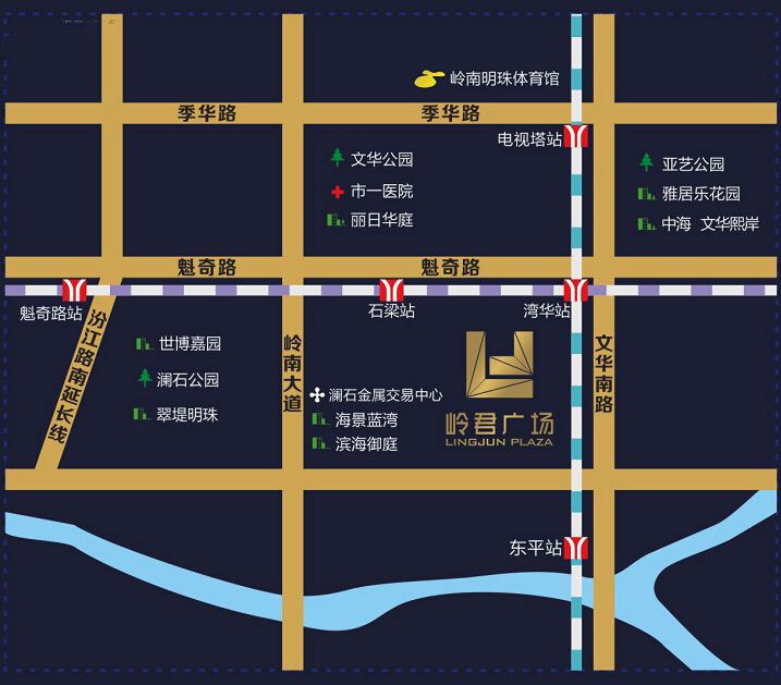 岭君广场位于魁奇路以南、文华路南延以西、黎明路以北。处禅城季华商务板块、禅西板块、新城板块三大板块,一纵(魁奇路)三横(南海大道、岭南大道、文化路)的城市交通干道。